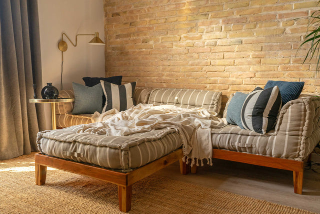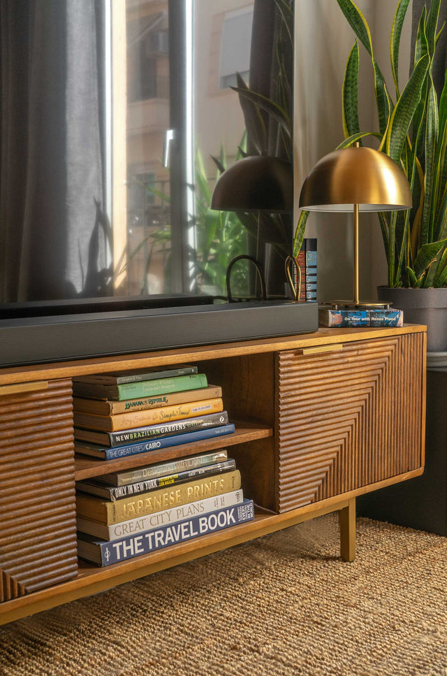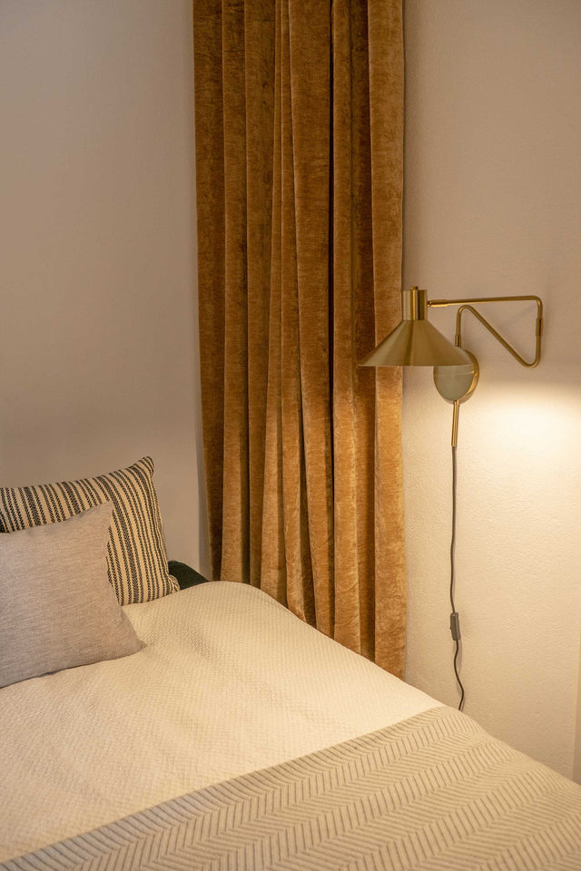 Blue and mustard were chosen as the dominant colors, along with lacquered wood and brass to match the detailing of the restored doors and associated hardware. Bright afternoon sun allowed the placement of large plants. A modular sofa was chosen for flexibility, providing enough floor space for a guest mattress or daily indoor workouts.