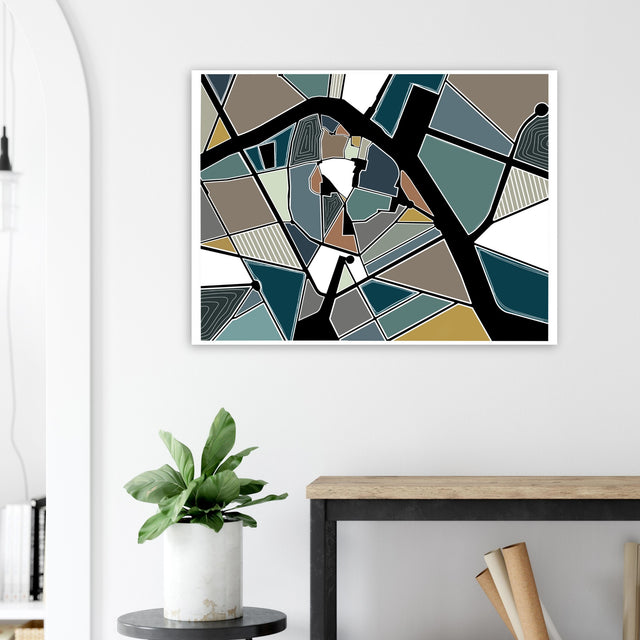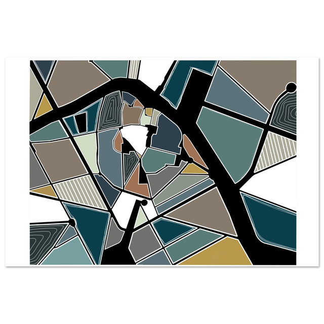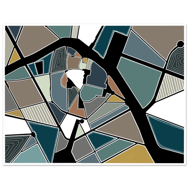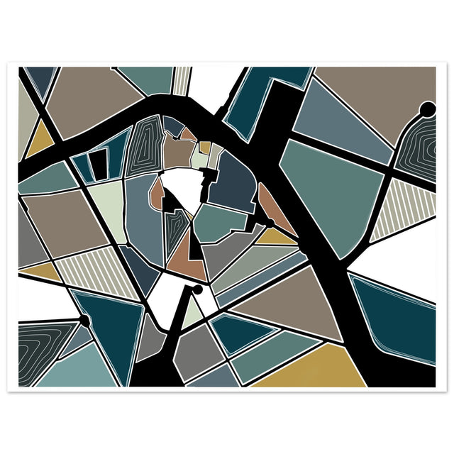 Abstracted map of Valencia, Spain in hues of blue. Known as 'la terreta', or 'the earth' in Valenciano. I always love looking out airplane windows to see the forms of agricultural fields. Impossibly straight lines juxtaposed to earthen curves. Here I've taken those forms and applied them to the city center. Reminiscent of the city's past, before it grew to what it is today.
